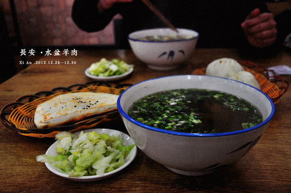 终于弄清楚了羊肉泡馍和羊肉汤的区别,一个是一起煮好的,一个需要自己动手掰馍的。更喜欢后者,有乐趣,且品尝到食物最初的鲜味。苏东坡曾云:陕烹唯羊羹。这家小店的题诗更让水盆羊肉这种西北汉子的粗犷食物有了一股子灵气:水源天际处,盆中怡清怀。