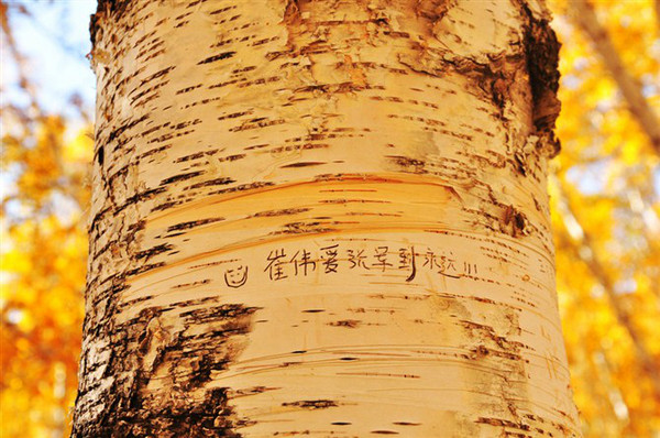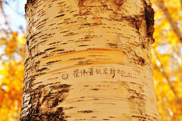 许多人在这里拍照。很多恋人在树干上刻字。