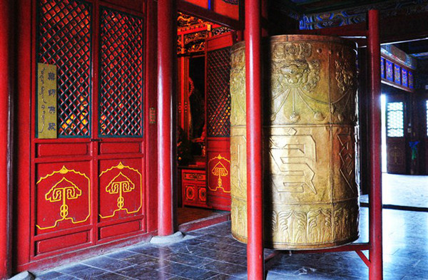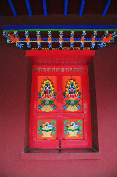 藏传佛寺有别于中土寺庙,以红黄蓝为主色调,喜用莲花、灯盏等意象。