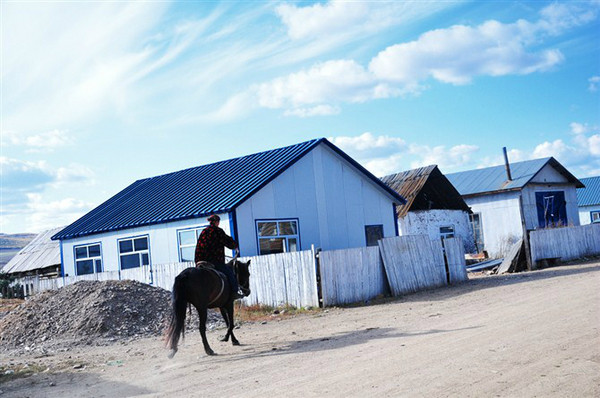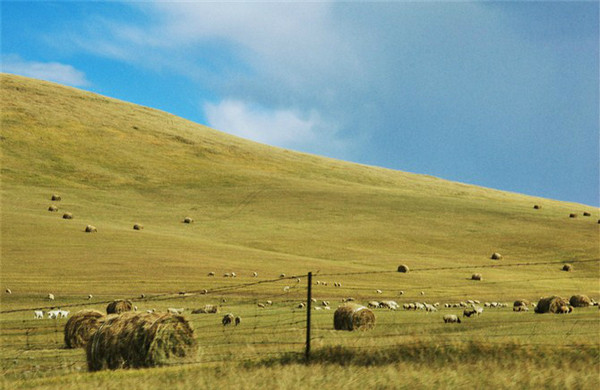 这种圆柱形的草垛子是机器收割的,给牛羊过冬用。如今,这里牧民的生活条件也渐渐宽裕。