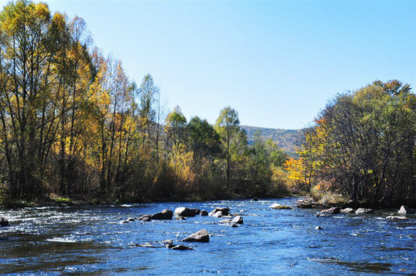 看了秋草秋田,秋山秋树,就是没有贴近看到秋水。脑子里一直萦绕着《时时刻刻》伍尔芙最后走向河流深处自杀的影像,肃杀,静美,大抵就是着秋日静流的意象吧。第三日启程便来到秋水河滩,因为河中散乱着几块礁石,游客称它为“黑石滩”。这简直就是武侠小说的套路嘛,说真的,名字和景致太不搭调。其实,有闲暇,在这河边坐上个一晌半日的,也是美事一桩。哗啦啦的声响,支颐聆听,正可枕石洗耳。