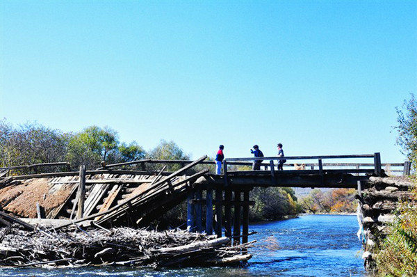 中午来到一处河边农家村庄歇脚。河边矗立一座破了大半截的危桥,可游人们上去一个个如履平地。脚下流水奔腾,一个窟窿就可能掉下去,你说好不好玩?