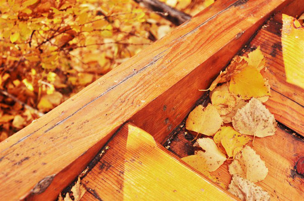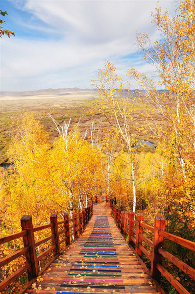 栈道设计地太相得益彰。木制的阶梯,同金灿灿的大片丛林融为一体,白云压低,远接天脉,走上一天都嫌不够。