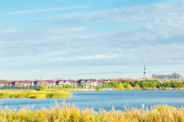 一处小小人工湖,对岸是豪华别墅区。
