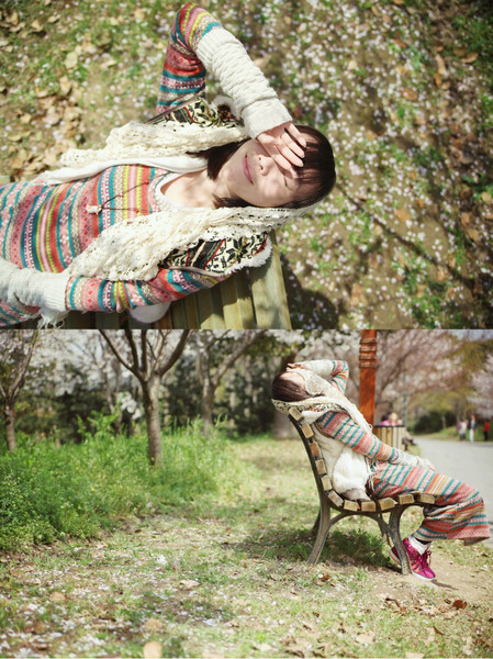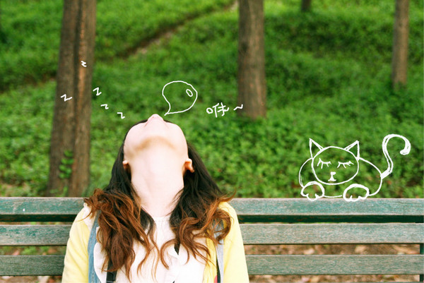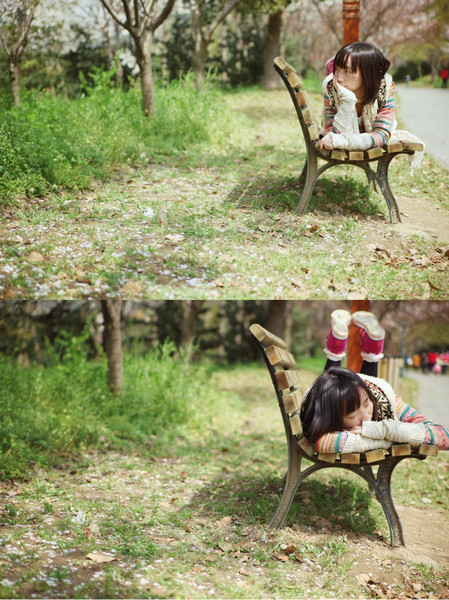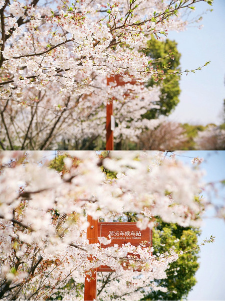 其实只是并不多的三四棵樱花树,可在阳光之下,就是美得那么耀眼夺目。让我在树下那张洒满了阳光碎片的长椅上流连忘返,连同旁边的木质游览车路牌,都变得充满日系味道来。