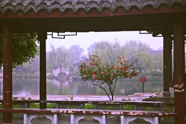 湖中的戏台,在烟雨中饶有氛围