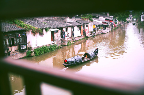 下船之后,可以上山再从高处俯瞰一下,旁边的河道上恰好有运石船开过,和乌篷船对比起来,成为有趣的画面。