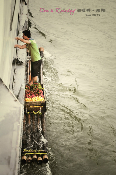 一开始看到他远远的划过来,以为要相撞了,没想他他是寄生在我们大船边买水果的,实在太厉害了