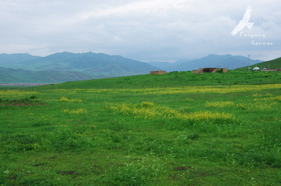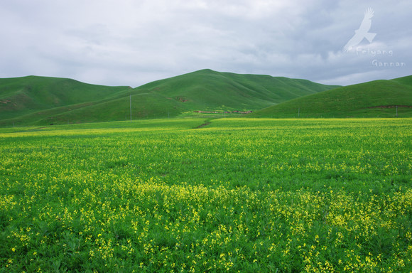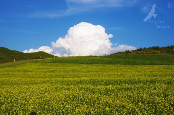 当周草原位于市郊南山脚下,正值油菜花开的季节,草原上除了牧草,就是大片的油菜花和青稞。临近傍晚,光线变的更加柔和,看天上云卷云舒,余晖给它镶上了金,一阵风吹过,汇成一颗心,再仔细看那心,中间还有一支箭穿过。