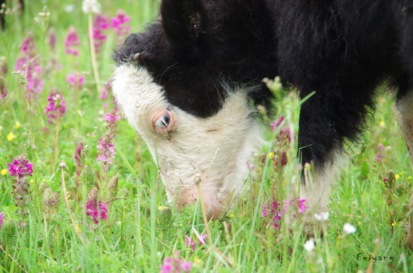 雨停的草原,天空和远处的山峦更加的有层次。近处的草地上开满了小花,白的、黄的、紫的,一群小牛犊在门口吃草。我刚想慢慢的靠近,扎西说去抓一只来,结果还未靠近小牛们就撒拉的跑了。一只小家伙没看清前面,脑袋撞在了帐篷布上一下摔倒了,晕了三秒才爬起来,然后又跑了,看得我们觉得很是可爱。