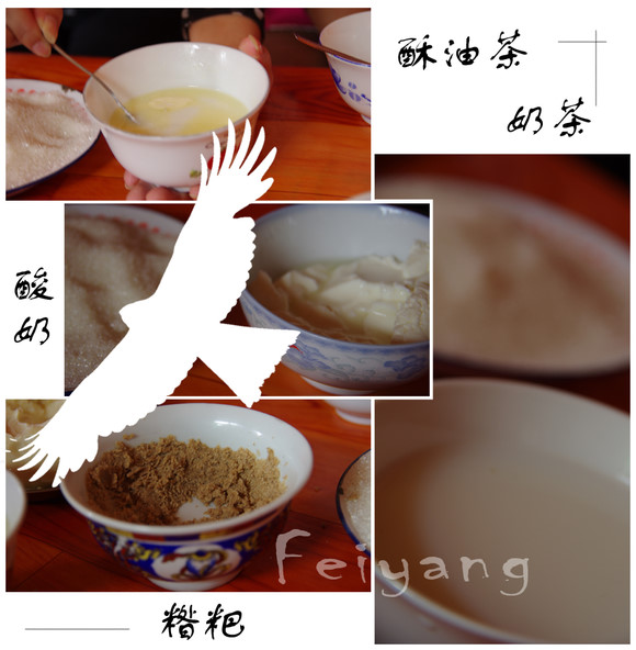 在草原兜了两小时,回到家里点心已是准备好,奶茶、糌粑以及酸奶。奶茶是新鲜刚挤的牦牛奶,喝的时候再在上酥油,加入的量多少根据个人的喜好,不过我是喜欢就微微加一点点酥油,我还是喜欢带有一点儿腥味的牛奶。酸奶吃的时候一定要放糖,否则是很酸,经过笑的示范,将酸奶和糖搅拌的十分均匀,酸酸甜甜的滋味十分美味。糌粑吃的时候要捏成小团,再加上酥油不停揉在里面,越揉越会出香味儿,扎西给我们揉了些口感非常好,可惜小梁后来试着做了些,因为酥油放多了,味道显然没有扎西做的好吃。