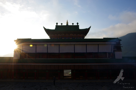 这座山头的标志就是山上有座展佛台,展佛台一般都会修建在离寺庙不远的山坡上,在特定的日子会展示佛像供人们集会瞻仰。虽然这个山坡并不高,不过因为3300米的海拔,一口气爬上去并且边走边打电话让我气喘吁吁,而当看到拉卜楞城沐浴在清晨阳光下后,我觉得,一切的疯狂都是值得的。