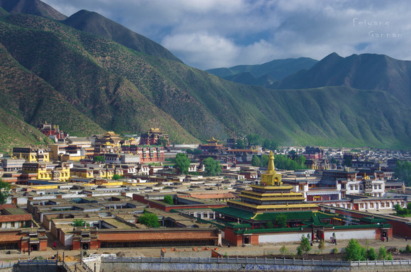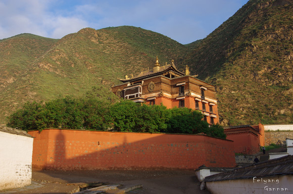 从大经寺出来往桑科草原的方向走,步过一个小木桥到一个山头,在那里便能看到拉卜楞寺的全景。早晨是欣赏全景的最佳时期,初升的太阳照在寺庙的金顶上散发出金光,白云、蓝天、青山、绿树、朱墙、金顶。