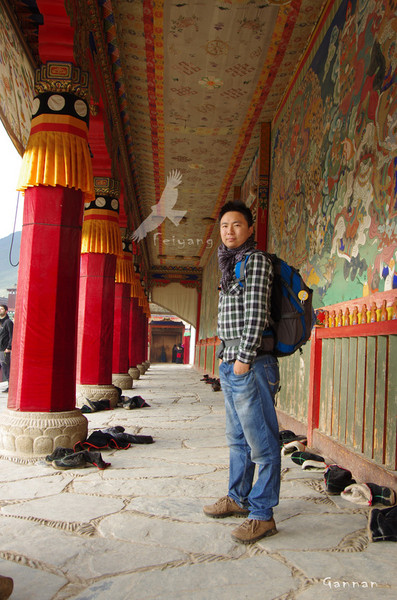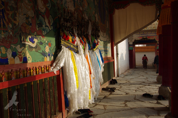 上早课的喇嘛将靴子脱于殿外,里面的诵经虽然我听不懂,但能感到它的虔诚和肃穆,就如同空气里弥漫的燃烧的青松枝的味道一般,这样的表达,虽习已寻常,但能感到它的认真。如同藏族人,从喜马拉雅山麓到青海湖畔,再到这无边的甘南草原,几乎藏区的每一寸土地,都在佛光的普照之下。他们因为自己的信仰而变得坚强从容、因为信仰而善良宽容,来来往往来自藏区各地的朝拜者、转经人、为自己家族祈福的女人或老人,因为自己的信仰而愿意付出自己此生的一切。就像后来我在西宁的塔尔寺看到的那些,不远千里而来朝拜的人们,在那连心菩提树下一遍又一遍的跪拜,为了信仰要在这儿行十万个长头。