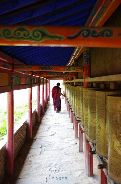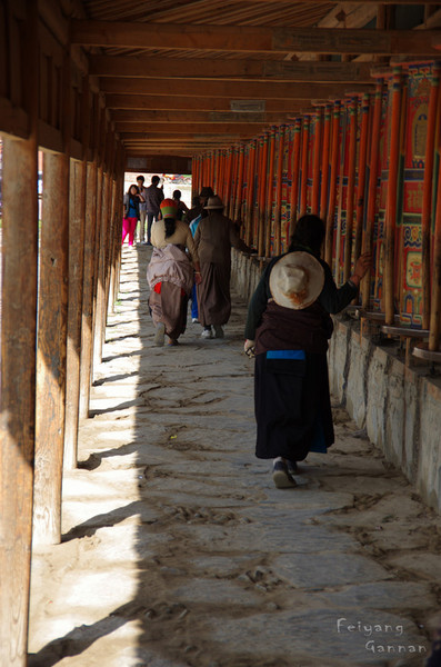 前往山头的路上有一排转经廊是藏区寺院中最长的转经廊,转经筒里装着六字真言等密咒和经文,当转经筒转动时就如同经书在翻动,每转动一次相当于诵经一次。
