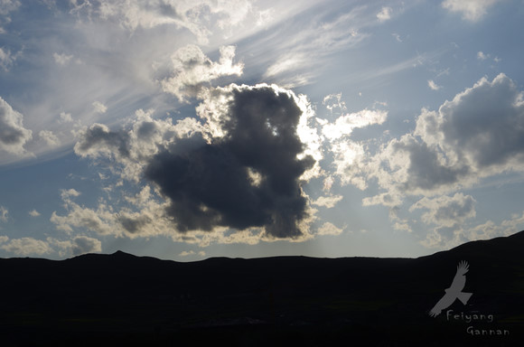 我们在太阳落山前赶到了唐克,天气却没给面子,阴着的天云层很厚日落是看不到了。我没穿外套,只穿着长袖T恤就跑上了山头,还是气喘吁吁的,山上已经有很多穿着冲锋衣等待光线的长枪大炮了。山上的一位老师傅装备和照片拍的确实很好,跟他请教了一阵拍出下面几张片子。这里确实是拍景的好去处,虽然没拍到日落,但是拍了拍很有层次感的云,有的,就很像一只微笑着的狼头。