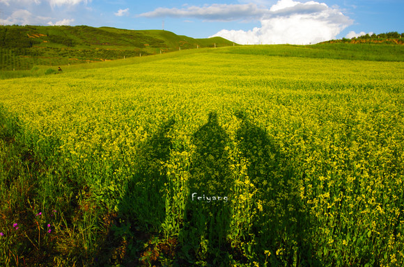 梁、谷子和我三个人来到了当周草原,这里的油菜花美的继续让我感慨着,斜阳将我们的身影拉长,投射在这无尽的美丽中去。