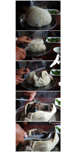中午的时候到达早已享誉国内外驴友圈的郎木寺,不过修路和连日的雨天让道路变的十分泥泞。我们入住了旅朋国际青旅,午餐在达老餐厅,达老餐厅的石烹羊肉很有特色,菜上来的时候只是一个白色热气腾腾的包,听说是羊肚,然后老板用刀开膛破肚,里面塞满了羊肉和石头,将石头拿出,便是利用石头热度烹熟的羊肉了,达老餐厅的酸奶也很好喝。