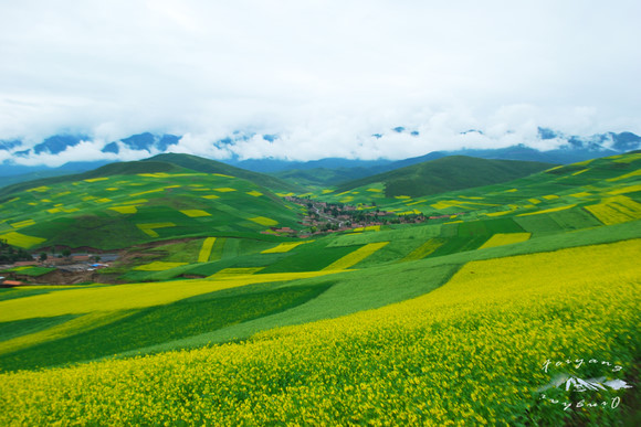 清晨的油菜花带着露水,山下,村子已开始一天的忙碌 2012/7/18 8:30