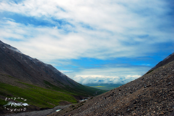 雨已经停了,但是云层依然很厚,顺着小马指的雪山的方向看过去,所有都笼罩在云雾之中。唯见一堆堆藏族人堆起的玛尼堆,和那条从天上飘下的洁白绸缎。
