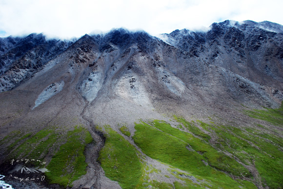 随着海拔的升高,雨点变成了冰粒,轻拍着挡风玻璃。再往上,高山草甸没有了,代替它们的是满山的碎石子。渐渐的前方已经没有路了,车停在一座石碑前,碑上写着“岗什卡雪山”。我们的脚下便是雪山积雪融化汇成的小溪,以及小溪顺着岩石流下形成的瀑布,“七彩瀑布”。