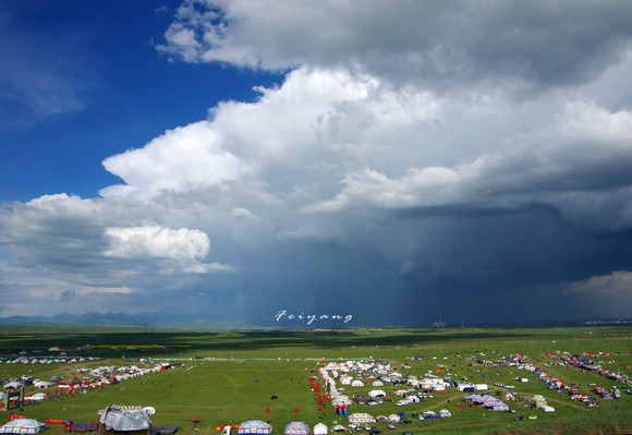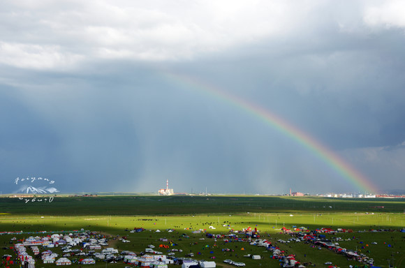 金银滩正值草原马会,在山头上我们喝着啤酒,吹着草原上的风,欣赏着晴朗天空下的草地蓝天。远处却是阵雨,雨过天晴后,一道彩虹出现了,从地平线升起,消失在云层中。在后来的旅程中我常常对秋伊说:“我们错过了晴天时候的青海湖,但是我们却看到了草原上的彩虹。”这是我看到的最大的彩虹!